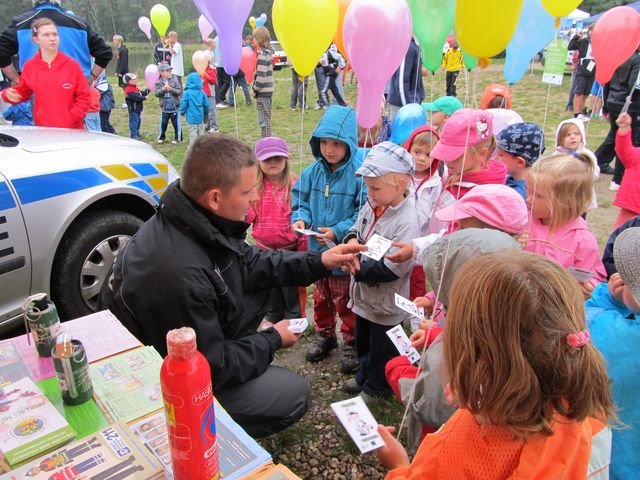 cyklistická desatera. Dále policista s některými pohovořil a následně jim i předal letáky o rizicích virtuální komunikace. Ti nejšikovnější odcházeli navíc i s z různými dárkovými předměty. Policejní „stánek“ si přišli prohlédnout i žáci nedaleké mateřské školy, kdy předškoláci dostali omalovánky, obrázky policistů a leták s tématem dětských autosedaček, který donesou svým rodičům.