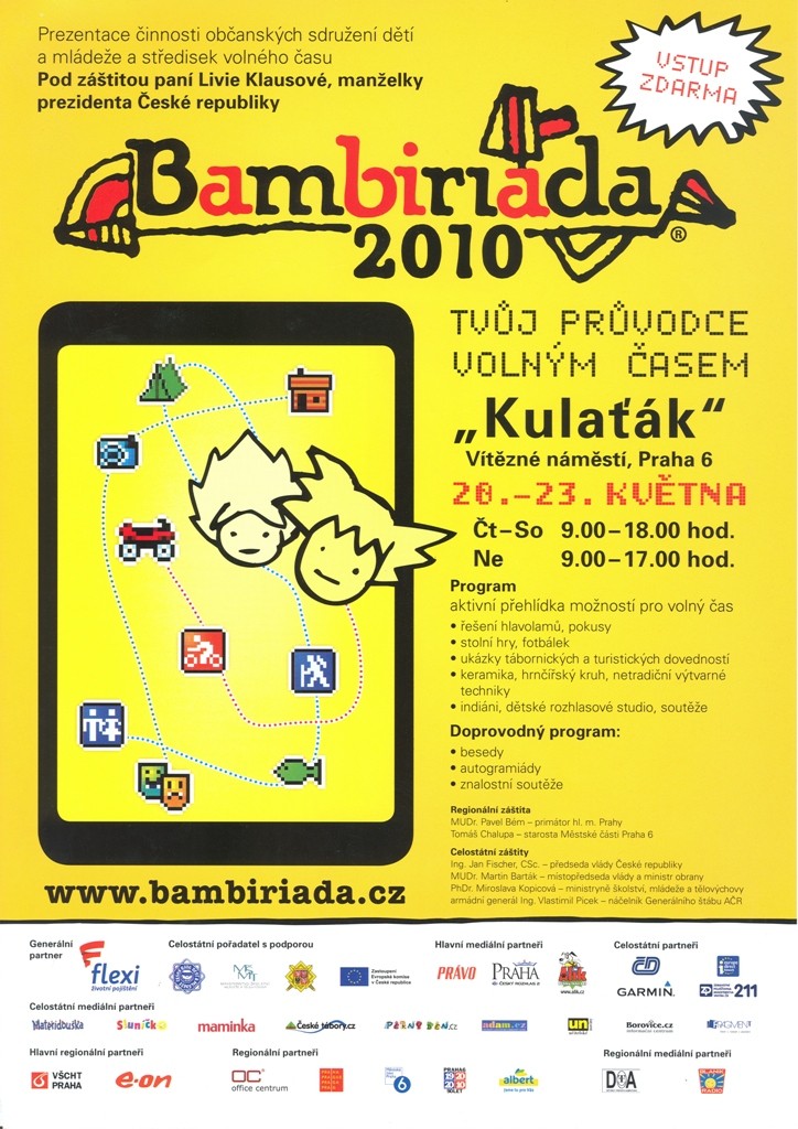 „Tvůj průvodce volným časem“, tak zněl slogan 12. ročníku Bambiriády, která proběhla ve dnech 20. – 23. května 2010 v Praze 6 na Vítězném náměstí. Letošní ročník tradiční přehlídky volnočasových aktivit byl „ochutnávkou“ programů rozličných mládežnických organizací, které se celoročně věnují smysluplné práci s dětmi.