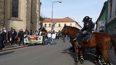 Drahomír Radek Horváth, že pochod ruší a mění jeho účel na náboženské shromáždění. Krátce po poledni toto shromáždění organizátorka farářka Československé církve husitské ukončila a účastníci byli vyzváni k pokojnému opuštění ulice Na Šarlejích. Zhruba sto aktivistů ale ukončení akce nerespektovalo a začalo blokovat nezákonným způsobem místo, kterým vedla řádně oznámená trasa pochodu DSSS. Na místě intenzivně pracovali policisté antikonfliktního týmu, tato snaha však byla marná.