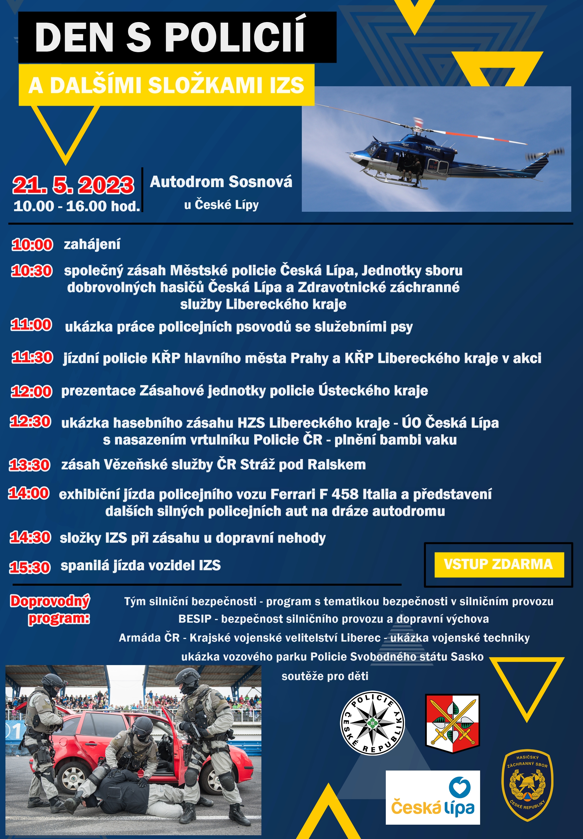 na neděli 21. května jsme pro vás na autodromu v Sosnové u České Lípy připravili šestihodinové pásmo ukázek činnosti Policie ČR a jejích partnerů z Integrovaného záchranného systému, který se stal mezinárodně respektovaným efektivním modelem spolupráce všech záchranných a bezpečnostních složek České republiky při zvládání mimořádných událostí.