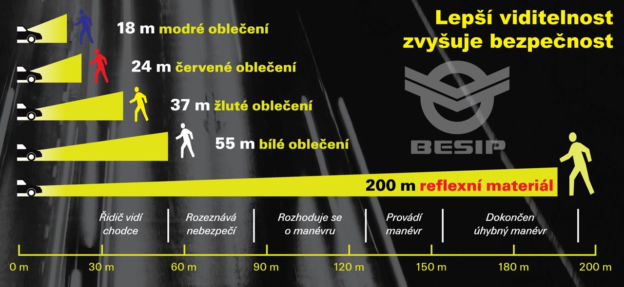 V souvislosti s nadcházejícím podzimním a zimním počasím, bychom rádi všechny upozornili na důležitost nošení reflexních prvků v dopravním provoze a na silnicích. Zejména chodci by měli mít na paměti, že je důležité nejen vidět, ale být viděn. Z níže uvedené porovnávací tabulky je patrné, jak vhodně zvolená barva svrchních oděvů a reflexní prvky zásadně zvyšují viditelnost.