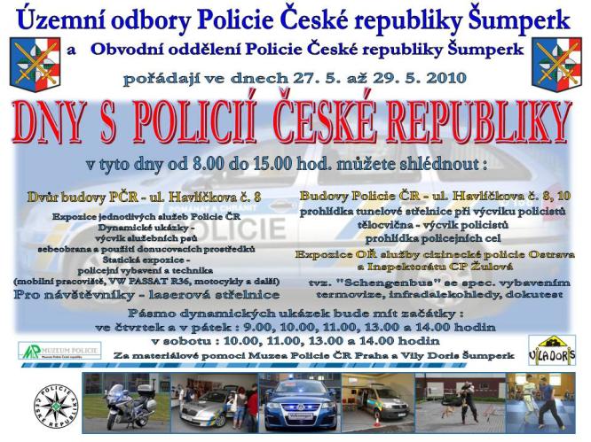 Územní odbory Policie České republiky Šumperk již tradičně pořádají “Dny s Policií České republiky“. Samotná akce proběhne od 27. do 29. května 2010 od 8.00 do 15.00 hodin v sobotu od 9.00 do 15.00 hodin. Program pro veřejnost je rozdělen do dvou částí. K uskutečnění první části jsou využity prostory garáží územních odborů, jedná se o statické ukázky policejní techniky a výbavy, kde jsou instalovány expozice jednotlivých složek policie, které jsou doprovázeny prezentacemi na PC a dataprojektorech. Každá expozice má svého policistů, který seznamuje s prací své součásti, seznamuje s vystavenou technikou a odpovídá na dotazy. V prostoru dvora jsou opakovaně (čt. pá. – 09.00, 10.00, 11.00, 13.00, 14.00 hodin a so - 10.00, 11.00, 13.00, 14.00.) prováděny dynamické ukázky nácviku a použití donucovacích prostředku, sebeobrany a výcviku služebních psů.