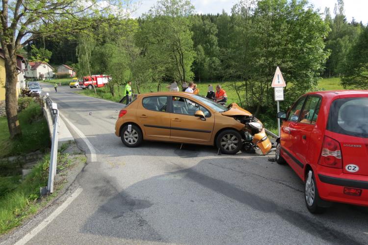 Druhá dopravní nehoda se stala včera v sedmnáct hodin na silnici II. třídy číslo 145, v katastru obce Stachy. Ze zavinění dopravní nehody je důvodně podezřelý řidič vozidla Hyundai, který při vjíždění z vedlejší pozemní komunikace nerespektoval svislé dopravní značení „Dej přednost v jízdě“, následkem čehož došlo ke střetu levé přední části vozidla Hyundai s přední částí vozidla Peugeot 207 jedoucím po hlavní silnici. Při nehodě došlo ke zranění spolujezdkyně vozidla Hyundai. Alkohol u obou řidičů negativní. Hmotná škoda na vozidlech je odhadem 170 000 korun.