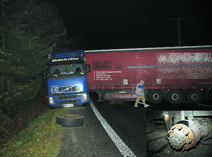 Dne 21. listopadu 2011 kolem 04:00 hodiny řídil čtyřiapadesátiletý muž nákladní automobil Volvo po silnici ve směru od Karlových Varů na Prahu. Za mysliveckou střelnicí vlivem toho, že si před jízdou nezkontroloval utažení matic na kolech, došlo k uvolnění matic na levém zadním kole tahače Volvo a k odpadnutí kola tahače. Jízdní souprava zastavila a začala se rozjíždět z kopce ve směru na Karlovy Vary. Následkem toho došlo ke vzpříčení vozidla na celé šíři komunikace silnice. U řidiče byla provedena dechová zkouška, která byla negativní. Řidič na místě dopravní nehody nepředložil platné pojištění odpovědnosti za škodu způsobenou provozem vozidla a dopravní policisté zjistili, že tahač má propadlou technickou kontrolu. Škoda byla předběžně odhadnuta na částku 80 tisíc korun.