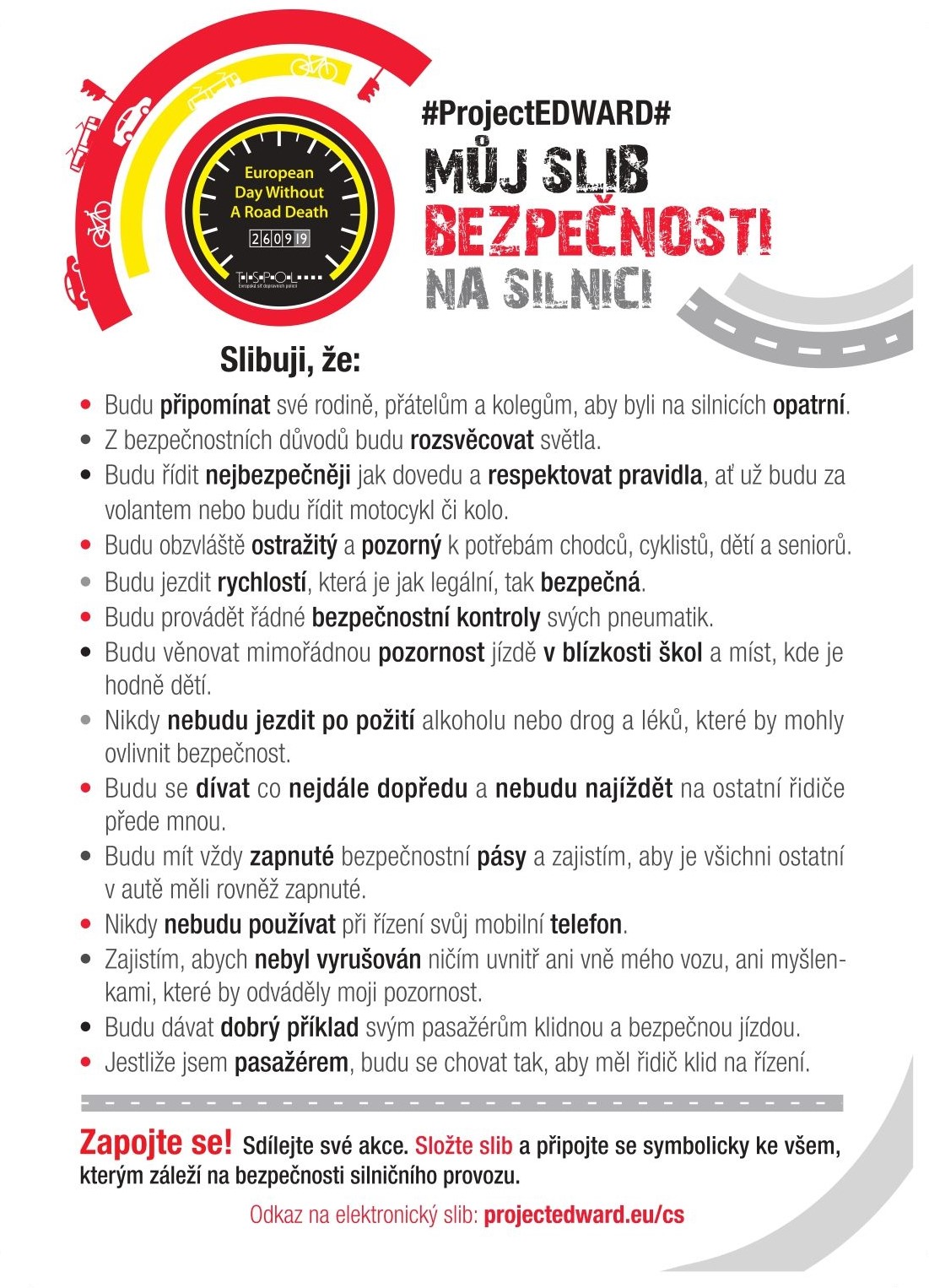 Slib bezpečnosti může složit každý z nás na webových stránkách projectedward.eu. plk. Zlý ke slibu dodává: „Věříme, že již samotné seznámení se s obsahem slibu přiměje čtenáře k zamyšlení se nad obrovskou zodpovědností, ale i zranitelností každého účastníka silničního provozu. Přemýšlejme, co můžeme změnit. Vždyť každé úmrtí spojené s dopravní nehodou je tak zbytečné!“