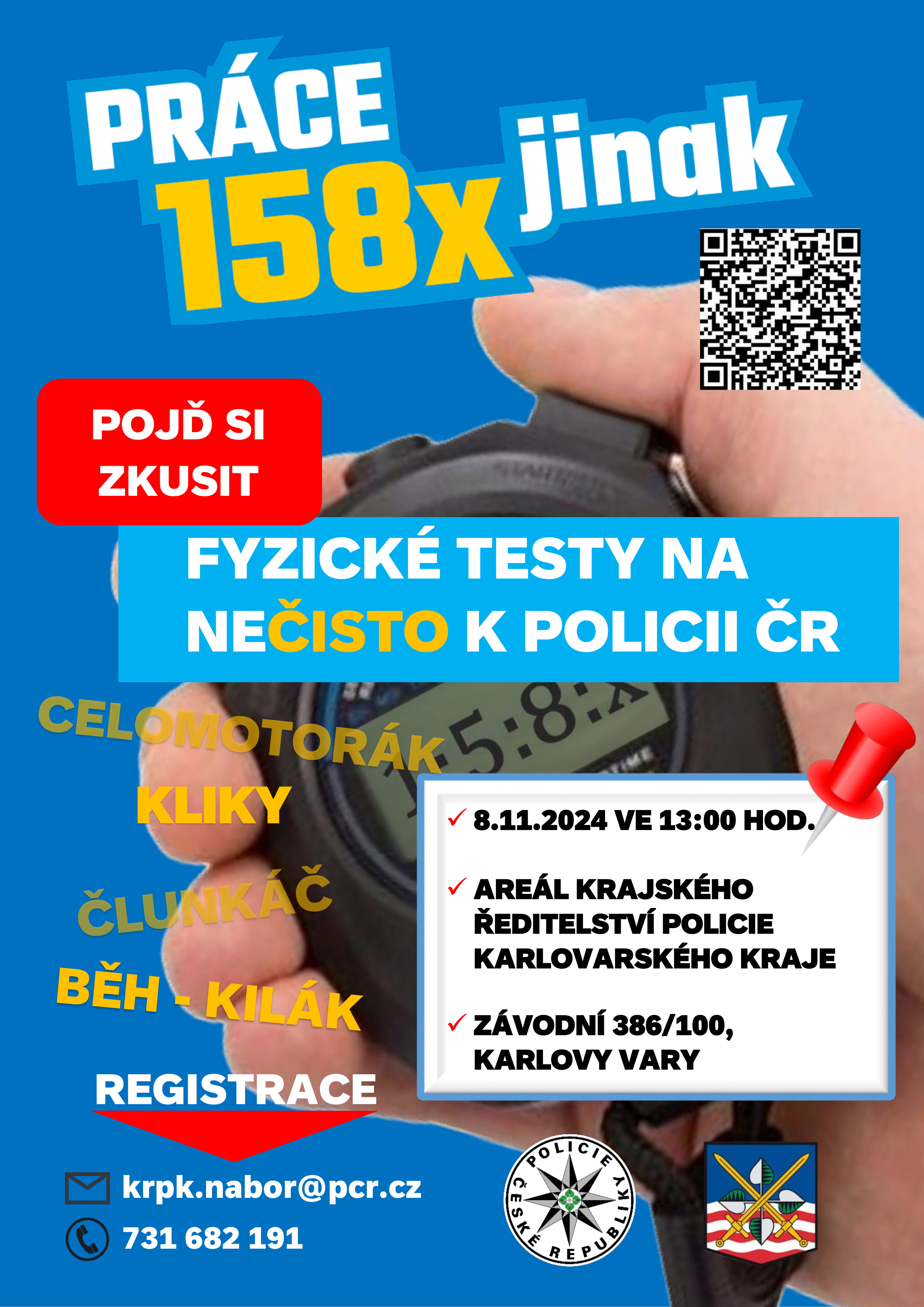 Dne 8.11.2024 se v areálu Krajského ředitelství policie Karlovarského kraje konají fyzické testy nanečisto. Pokud si chceš vyzkoušet, zda máš fyzičku pro přijetí do služebního poměru, tak není nic jednoduššího, než si to přijít v pátek 8. 11. 2024 od 13:00 hodin vyzkoušet. Vsaď se s kámoši, kdo bude mít lepší výsledek a doraz s partou.