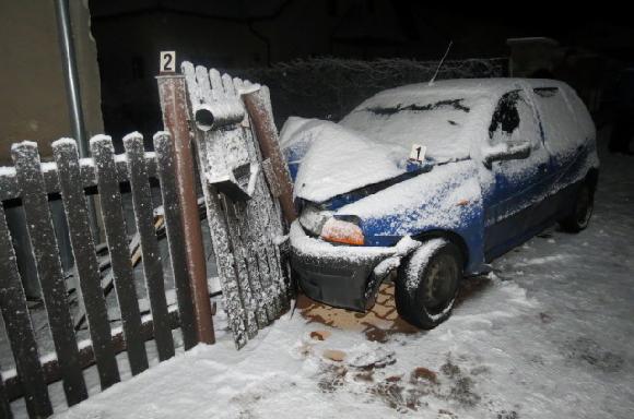 třiadvacetiletá řidička osobním vozidla Fiat Punto ve směru od Jičína na Slatiny. V Popovicích dostala zřejmě vlivem nepřiměřené rychlosti jízdy na zasněženém povrchu vozovky smyk, který nevyrovnala, a následně vyjela vpravo mimo komunikaci, kde narazila do oplocení domu. Alkohol u řidičky, která utrpěla lehké zranění, byl vyloučen dechovou zkouškou. Celková škoda byla vyčíslena na 35 tisíc korun.