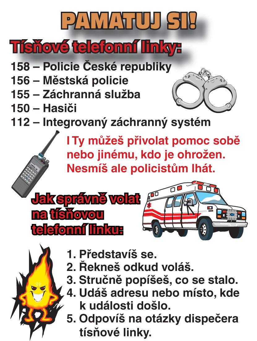 • pokud se ocitněš v nouzi, požádej o pomoc - v naléhavých případech, kdy je například ohrožen život nebo zdraví, se neboj volat na tísňovou linku Policie České republiky 158