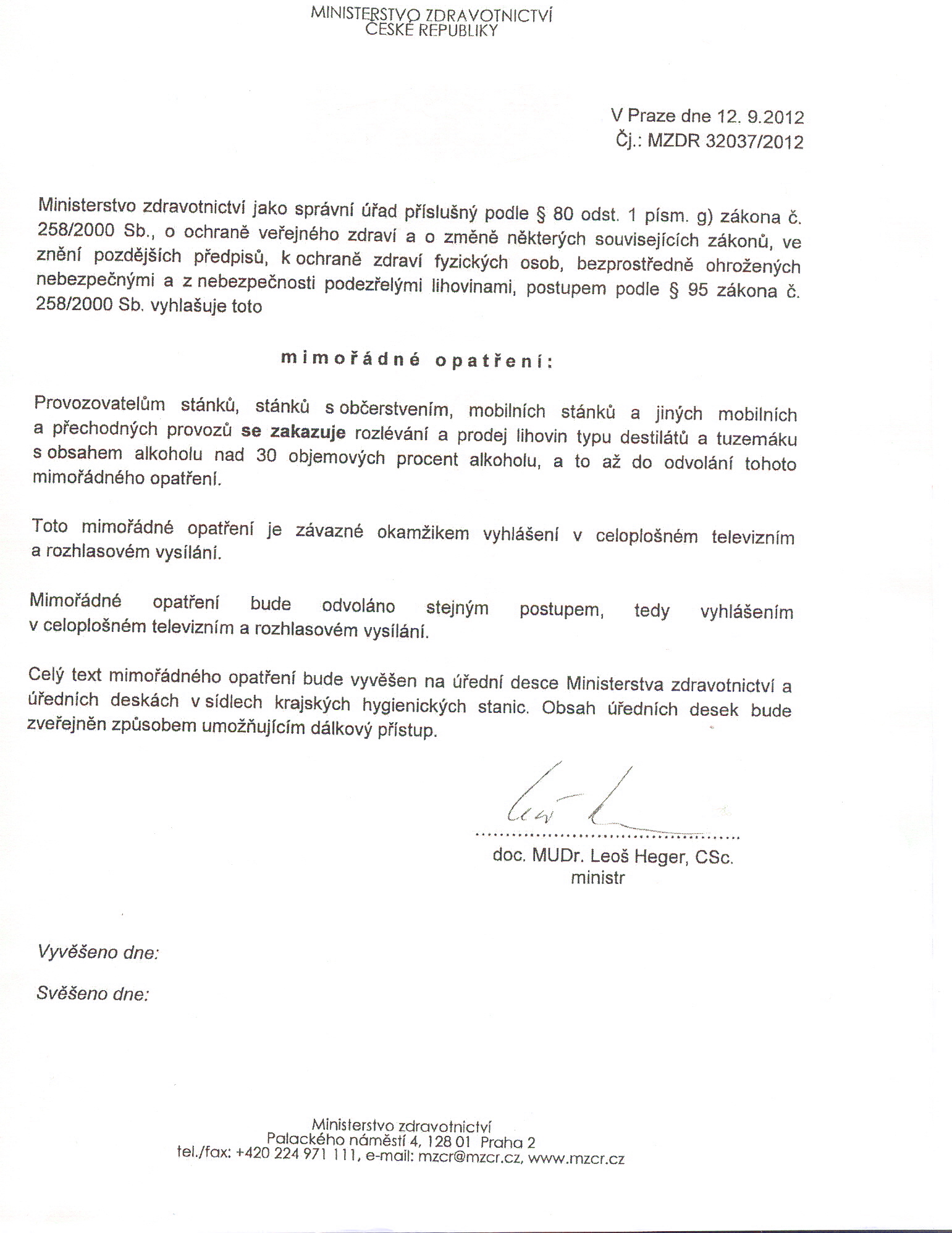 Ve středu 12. září 2012 vydalo Ministerstvo zdravotnictví mimořádné opatření, které se týká zákazu rozlévání a prodeje lihovin s obsahem alkoholu nad 30 objemových procent alkoholu (viz související dokument). V souvislosti s tímto vládním nařízením přijala mimořádná opatření také Policie ČR, Krajské ředitelství policie Libereckého kraje a již ve středu v podvečer proběhlo také jednání s vedením Krajské hygienické stanice Libereckého kraje. Krajská hygienická stanice Libereckého kraje byla také pověřena koordinací činností všech složek, které se na mimořádném opatření podílejí (HZS, Celní správa, PČR, ČOI, SZPI, atd.).