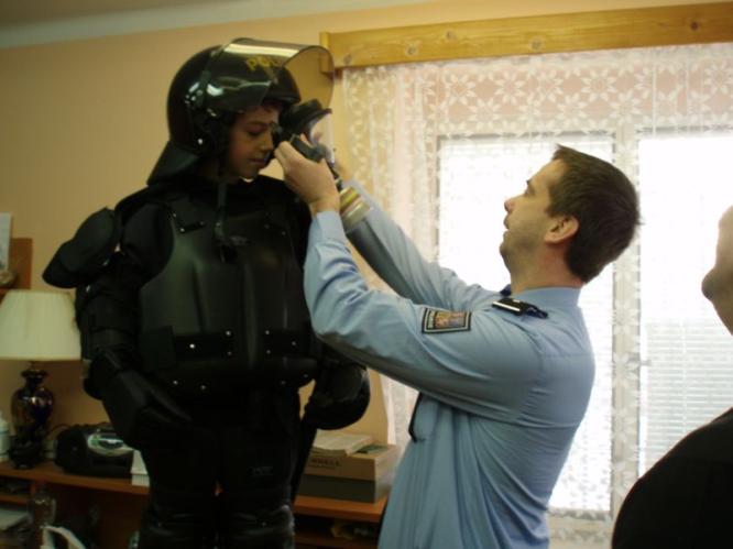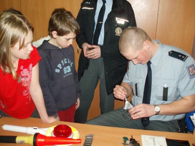 Následně si žáci prohlédli prostory, ve kterých policisté denně pracují. V jedné z kanceláří si děti prohlédly výzbroj policistů v běžném výkonu služby i výstroj policisty zařazeného do pořádkové jednotky. Některé součásti si měly děti možnost vyzkoušet samy na sobě. Policisté jim v průběhu celé akce svým poutavým výkladem přiblížili práci a činnost Policie ČR - a to především práci policisty obvodního oddělení a policejního technika. Děti vše se zájmem poslouchaly a samy měly mnoho dotazů, na které jim policisté rádi odpovídali. Všichni žáci si také zkusili jaké to je, když policista snímá otisky prstů - z této části akce si každý odnesl svůj „Certifikát“ o pravosti svých otisků prstů. Žáci se zájmem sledovali právě ukázku práce policejního technika při zajišťování daktyloskopických stop na místě činu.