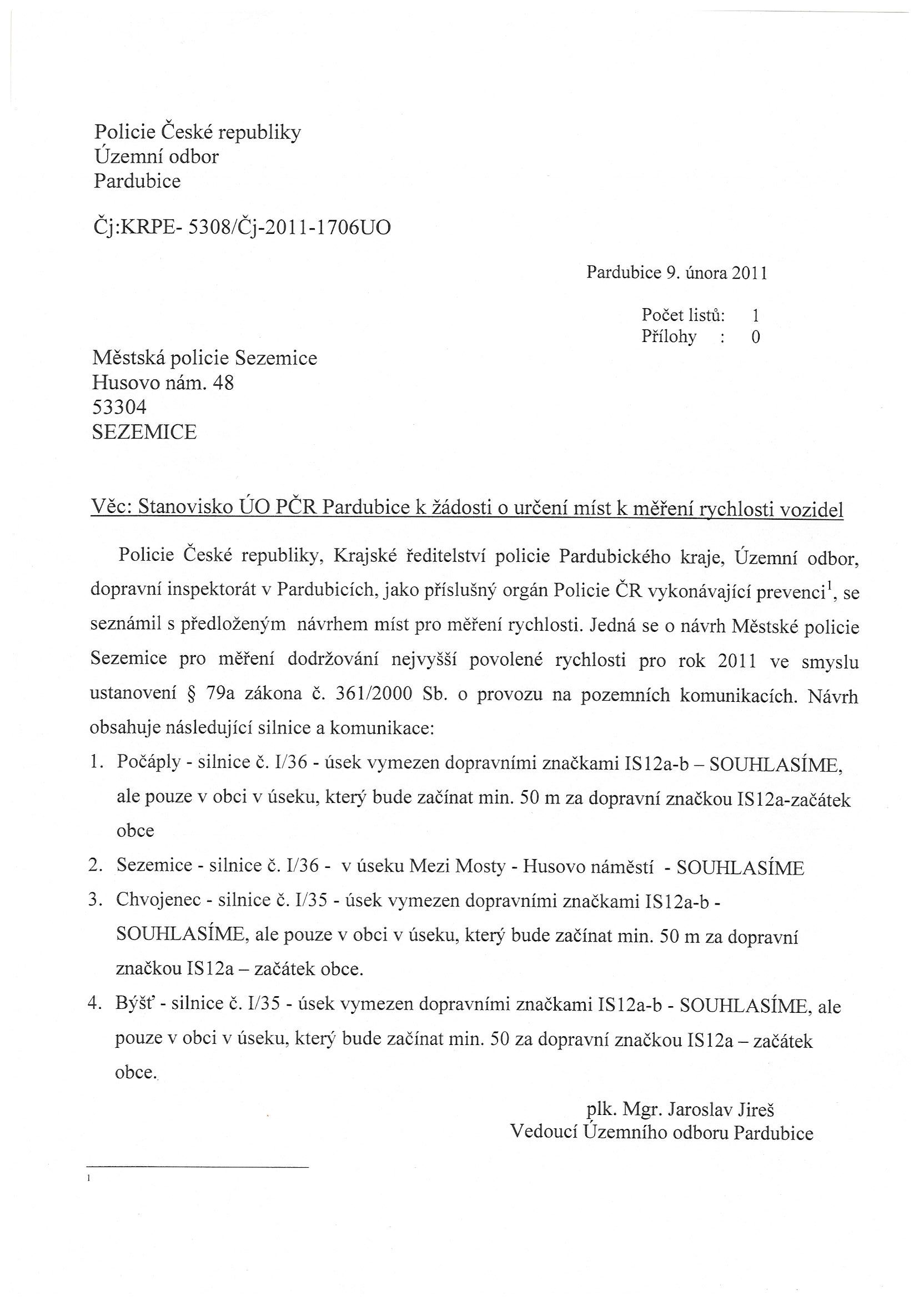 Odpověď na žádost o sdělení, jaká místa byla určena Policií ČR k měření rychlosti pro rok 2011 v Březové nad Svitavou.