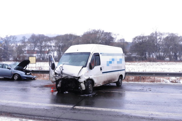 Foto: dopravní nehoda Alfa a Peugeot za obcí Valšov ze dne 28.11.2013nepřizpůsobila rychlost stavu a povaze komunikace a na namrzlé silnici dostala smyk. Následkem smyku se ocitla v protisměru, kde čelně narazila do projíždějící dodávky Peugeot. Podle prvotních informací došlo k lehkému zranění řidičky vozidla Alfa Romeo a třech osob z vozidla Peugeot. Všichni zranění byli převezeni rychlou zdravotnickou službou do nemocnice v Krnově. U obou řidičů bylo odborným měřením vyloučeno požití alkoholu.