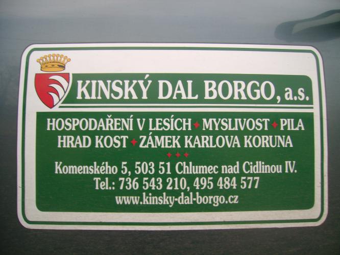 Levé a pravé dveře vozidla jsou označeny samolepkou s logem firmy „KINSKÝ DAL BORGO, a.s.“ o velikosti 30 x 50 cm v zelenobílém provedení.