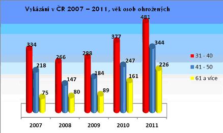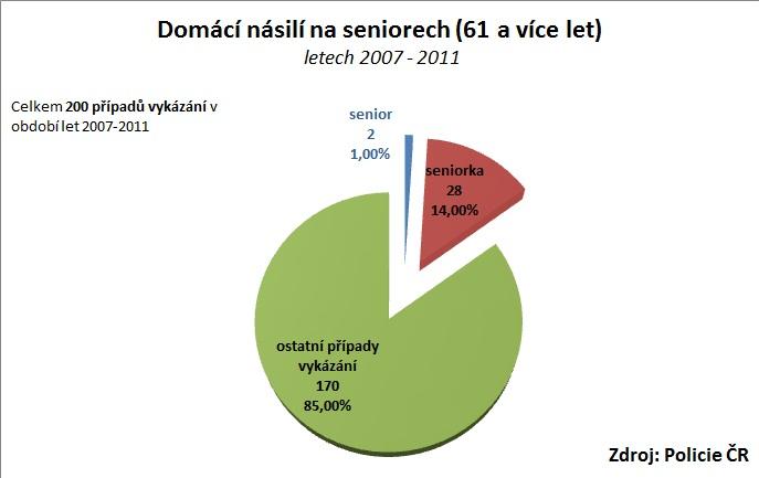 V České republice lze vykázat násilnou osobu již pět let (od roku 2007). Policisté v průběhu let registrují nárůst počtu ohrožených seniorů na trojnásobek. Zamíříme-li na Ostravsko, pak konstatujeme nárůst ohrožených seniorů domácím násilím (u zjištěných případů a vykázání) v letech 2010, 2011. Křivka nárůstu není nikterak dramatická, nicméně zvýšení počtu seniorů jako osob ohrožených je dle našich statistik zřejmá. Zatímco v roce 2009 jsme zaznamenali u vykázání celkem čtyři ohrožené seniory na Ostravsku, v roce 2010 jich bylo již 3x víc – 12 osob ohrožených, v roce 2011 bylo detekováno devět ohrožených seniorů při vykázání. Za pět let (2007 – 2011) vykázali ostravští policisté celkem dvěstěkrát, z toho registrujeme 30 osob ohrožených starších 61 a více let (28 žen a 2 muži), což je 15 procent z celkového počtu.