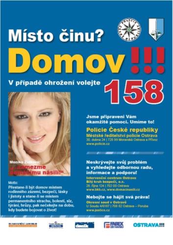 V květnu a červnu proběhla v Ostravě výtvarná a fotografická soutěž s tématem domácího násilí. Autoři vítězných děl byli ocenění věcnými dary při slavnostním Dni Policie na Slezskoostravském hradě dne 21.6.2010. Některé z vítězných fotografií byly použity na tiskoviny, které byly zhotoveny v rámci mediální kampaně, která „startuje“ v Ostravě 17.9.2010 a dostala vševystihující název „Místo činu? Domov!“. Jsme velmi rádi, že boj s domácím násilím na Ostravsku podpořila paní Monika Žídková, která se stala „mediální tváří“ kampaně. Ale ani ostatní subjekty nejsou k tomuto závažnému násilí lhostejné, mediálními partnery se stal Moravskoslezský deník, Český rozhlas Ostrava a Fabex Ostravsko. Zpravodajsky akci podpořila také Česká televize Ostrava. Velký dík patří Dopravnímu podniku Ostrava a.s., který zajistil zvukové relace v prostředcích MHD. Cestující tak mohou slyšet doporučení ve znění: „Jste ohroženi ve svém vlastním domově? Neskrývejte svůj problém a vyhledejte odbornou radu a podporu! Nebojte se hájit svá práva! Pomůžeme Vám, umíme to! V případě ohrožení domácím násilím volejte 158!!!“. Poděkování však patří také zástupcům ostravských supermarketů či obchodních center, neboť plakáty s informacemi o domácím násilí jsou umístěny i v těchto provozovnách.  Dále byly plakáty v rámci kampaně distribuovány do ostravských škol, školek, úřadů, zdravotnických zařízení, služeben městské policie….. Cílem kampaně i medializace problému je rovněž vyvolat intoleranci veřejnosti k předmětnému problému a její motivace k pomoci při odhalování domácího násilí i eliminace nejzávažnějších následků domácího násilí na životech a zdraví oběti. Pomůžeme-li kampaní zjistit (a následně řešit) jediný případ týrání dítěte, seniora, ženy, pak si můžeme říci, že jsme byli úspěšní! Za pomoc v boji s domácím násilím však děkujeme také všem dalším subjektům, které se na akci podílejí, i dalším médiím, které zveřejněním informací třeba také napomohou oběti rozhodnout se učinit ten první krok, vystoupit z kruhu neustálého strachu a marné naděje ve zlepšení krizové životní situace….