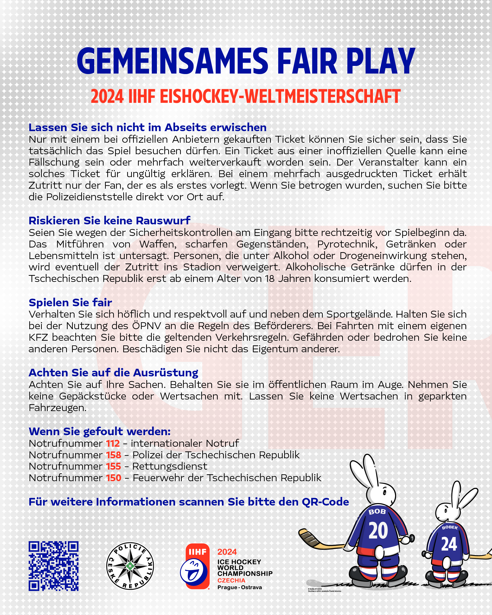 Co tím myslíme? Jistotu vstupu na zápas máte jen při nákupu vstupenky z oficiálních zdrojů. Pokud koupíte vstupenku z neoficiálního zdroje, např. přes inzerát, s vysokou mírou pravděpodobnosti se na vytoužený zápas nedostanete. Přeprodeje často fungují tak, že je jedna vstupenka prodána vícekrát nebo je prodán padělek. Mimo oficiální zdroje tedy rozhodně nákup nedoporučujeme. Oficiální informace k prodeji vstupenek jsou k dispozici na webových stránkách 2024.iihfworlds.com/vstupenky, kde najdete přehledný rozcestník, který vás dle vaší poptávky na vstupenky dostane na stránky oficiálních prodejců vstupenek Ticketportal a Ticketmaster.