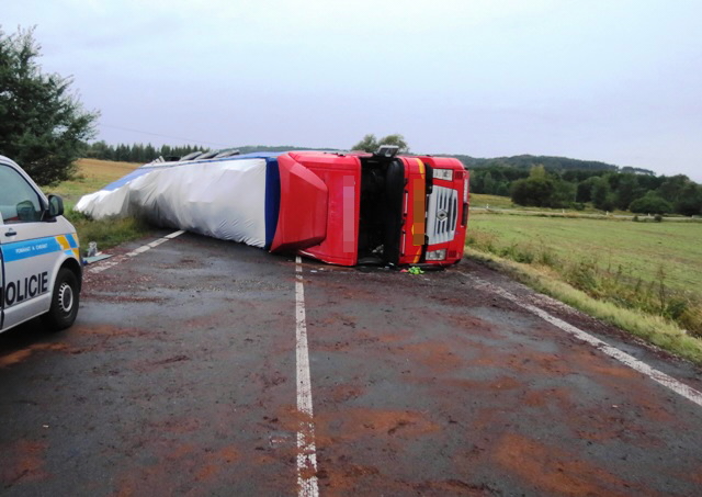 Foto č.1: dopravní nehoda nákladní soupravy mezi obcí Krnov a její částí Krásné Loučky ze dne 11.09.2013