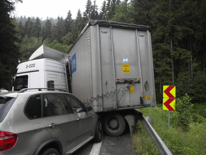 Na silnici mezi Železným Brodem a Loužnicí, v úseku zatáček u Muchomůrek došlo ve středu 8.7.2009 v 8,15 hodin k další nehodě. Ve směru od Železného Brodu na Tanvald jel 30-letý řidič z Mladé Boleslavi s vozidlem Mercedes Benz. Při průjezdu pravotočivou zatáčkou nepřizpůsobil rychlost vozidla stavu a povaze vozovky, na mokrém povrchu dostal smyk, vyjel do protisměru a bokem tahače narazil do protijedoucího vozidla BMW X5. Při nehodě došlo k úniku nafty z vozidla, kterou následně bylo nutné lokalizovat. Způsobená škoda činí 165 000 Kč. Řidič nákladního vozu si z nehody odnáší i blokovou pokutu ve výši 2 000 Kč.