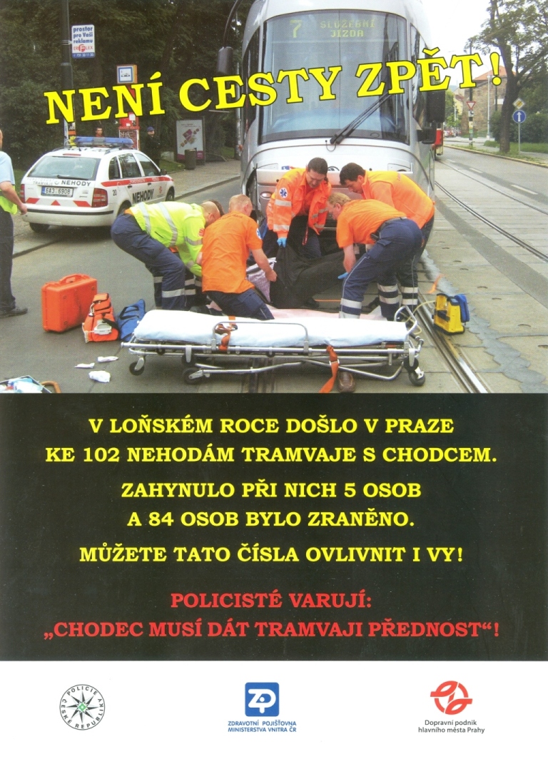 Od dvacátého června tohoto roku se cestující v tramvajových soupravách Dopravního podniku hlavního města Prahy budou setkávat s plakáty, které znázorňují dopravní nehodu zapříčiněnou chodcem. Mají evokovat nejvíce ohrožené účastníky silničního provozu k bezpečnému chování.