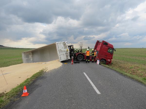 Včera 18.9. v 13:55 hod. došlo na silnici č. II/324 mezi obcí Lubno a Dolní přím k dopravní nehodě. Řidič nákladního vozidla Mercedes s návěsem jedoucí od Lubna na Dolní Přím, aby zabránil střetu s protijedoucím vozidlem, které částečně vjelo do protisměru, najel co nejvíce na pravý okraj komunikace, který se pod jeho vahou utrhl.  Skončil v příkopě napříč přes silnici a návěs, z kterého se vysypal převážený náklad do příkopu a na přilehlé pole, se převrátil na pravý bok. Kvůli nehodě a následnému úklidu rozsypaného síranu amonného musela být silnice po dobu 3 hodin zcela uzavřena a ostatní řidiči museli použít objízdné trasy. Ke zranění řidiče nedošlo a alkohol byl u něho vyloučen dechovou zkouškou. Předběžná škoda byla vyčíslena na 630 tisíc korun.