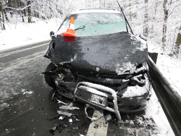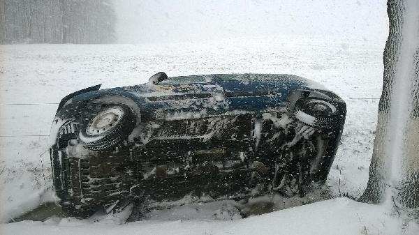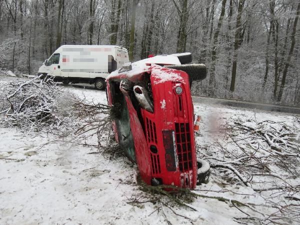 Na Trutnovsku mezi obcemi Bernartice a Zlatá Olešnice před devátou hodinou ranní havarovalo osobní auto Renault řidičky, která při průjezdu levotočivé zatáčky dostala na zasněžené silnici s autem smyk, který nezvládla. Auto vjelo do protisměru, vyjelo mimo silnici a převrátilo se v příkopu na levý bok.