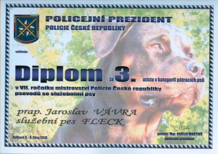 Získali diplom v kategorii hlídkových psů za nejlepší výsledek v disciplině pachových prací. Za nejlepší stopu získali 98 bodů ze 100.