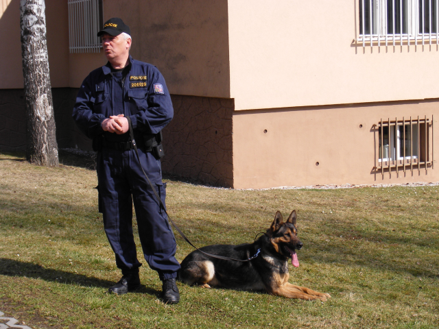 Na fotografii je zasahující policista pprap. Stanislav Tatár s jeho psem Frenkem.