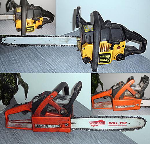 - Pila značky DOLMAR, jedná se o řetězovou motorovou pilu na benzín, červenooranžové barvy, s černým vrchním krytem rukojetě a brzdy, na liště má nápis červené barvy WINDSOR ROLL TOP Mini.