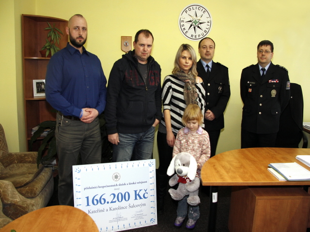 Mostecká policie v úterý 19. února 2013 předala symbolický šek Kateřině Šulcové, jejíž manžel, policista, zemřel v polovině prosince ve věku 34 let, když podlehl zákeřné nemoci. Mostečtí policisté spolu s Unií bezpečnostních sborů zorganizovali peněžní pomoc, která by alespoň trochu zmírnila nelehkou situaci pozůstalé manželky a její malé dcery Karolínky. Byl zřízen účet, kam mohli příspěvky poslat nejen policisté a příslušníci dalších bezpečnostních složek, ale i široká veřejnost. Díky solidaritě policistů a kolegů z ostatních bezpečnostních sborů a občanů z celé republiky se na kontě sešla slušná částka ve výši 166 200 korun. Symbolický šek s touto částkou včera na půdě Územního odboru Policie ČR v Mostě převzala Kateřina Šulcová spolu s dcerou Karolínkou od vedoucích představitelů mostecké policie plk. Mgr. Jiřího Volprechta, plk. Ing. Bc. Jindřicha Bergmanna a zástupce Unie bezpečnostních sborů pprap. Bc. Zdeňka Drexlera.