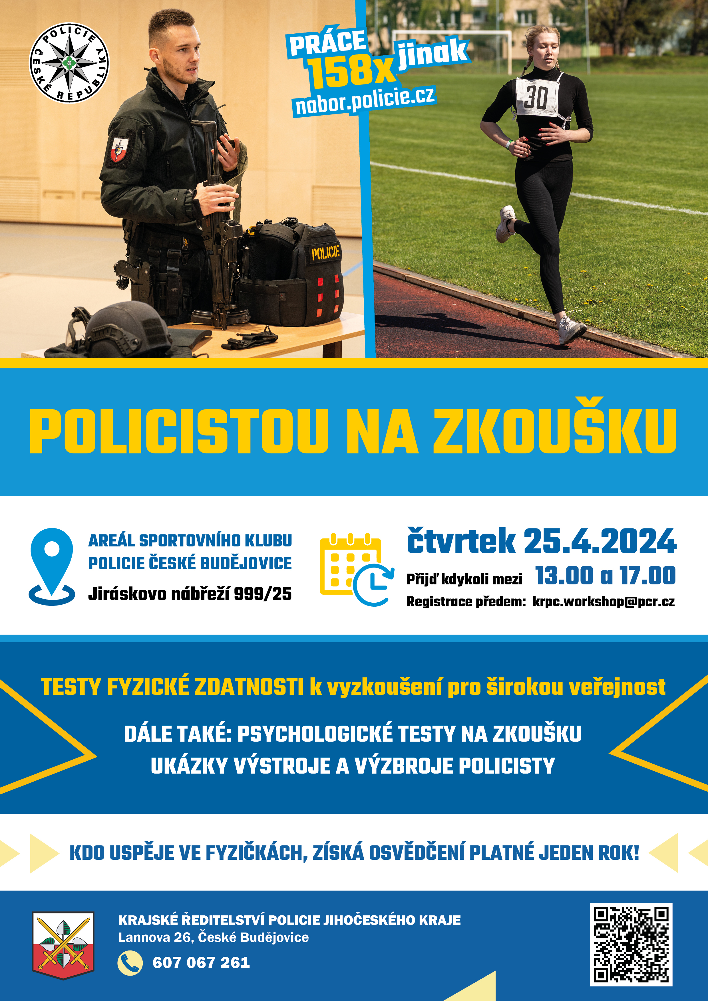Jestli máš chuť to zkusit, tak se dopředu zaregistruj na email: krpc.workshop@pcr.cz a přijď na workshop POLICISTOU NA ZKOUŠKU, který se bude konat tentokrát ve čtvrtek 25. dubna od 13:00 do 17:00 v areálu Sportovního klubu policie České Budějovice na Jiráskově nábřeží 999/25. Přijít můžeš kdykoliv v uvedeném čase. Získáš-li osvědčení o zvládnutí fyzických testů, máš jednu část přijímacího řízení k jihočeské policii úspěšně za sebou.