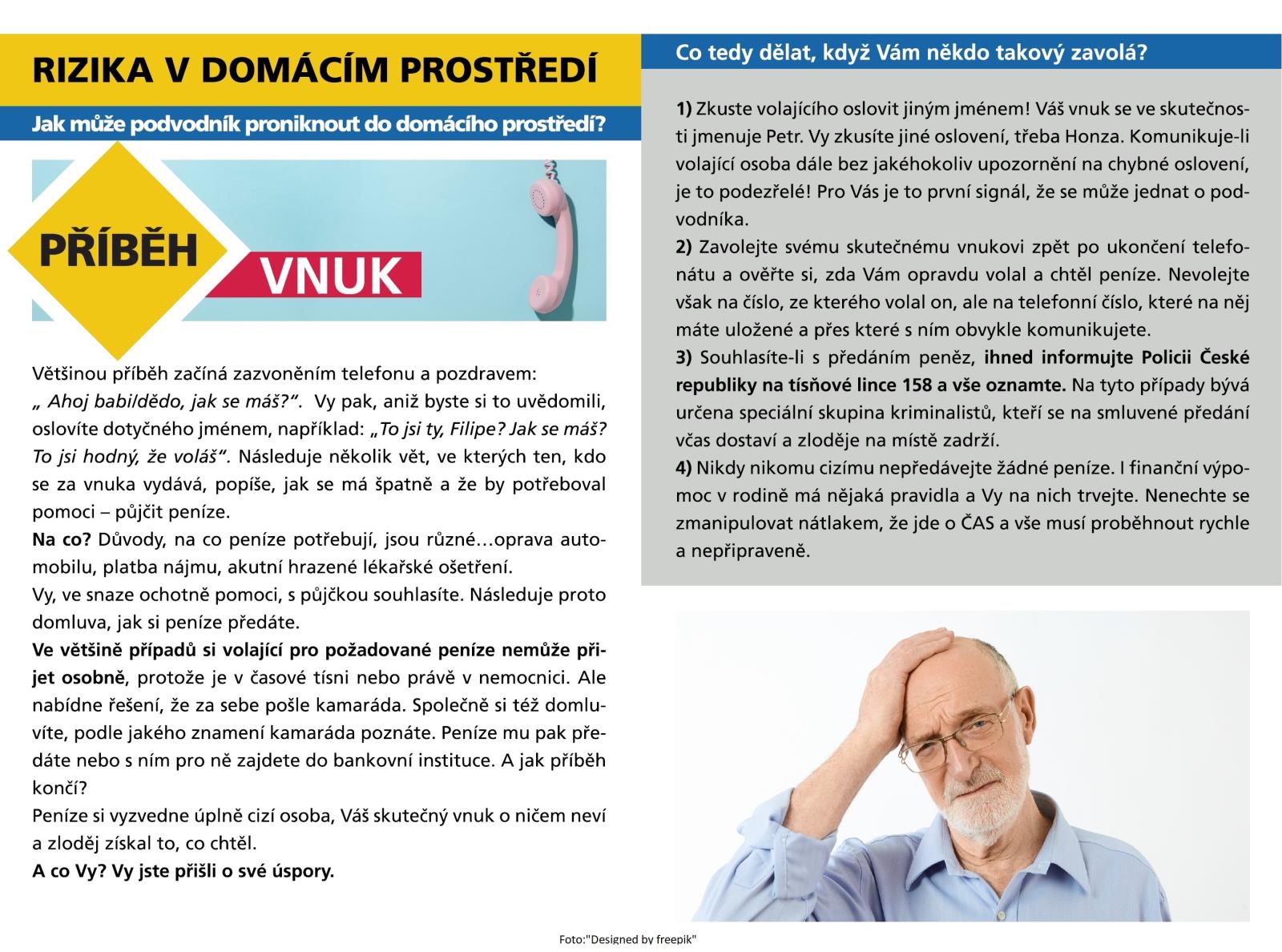 V další fázi preventivní kampaně pod názvem „Pomáháme seniorům, chráníme seniory“ se proto zaměříme na jeden ze starších, leč stále velice aktuálních, modelů podvodného jednání, které je poslední dobou na vzestupu a je typicky nazýváno „vnuk“.