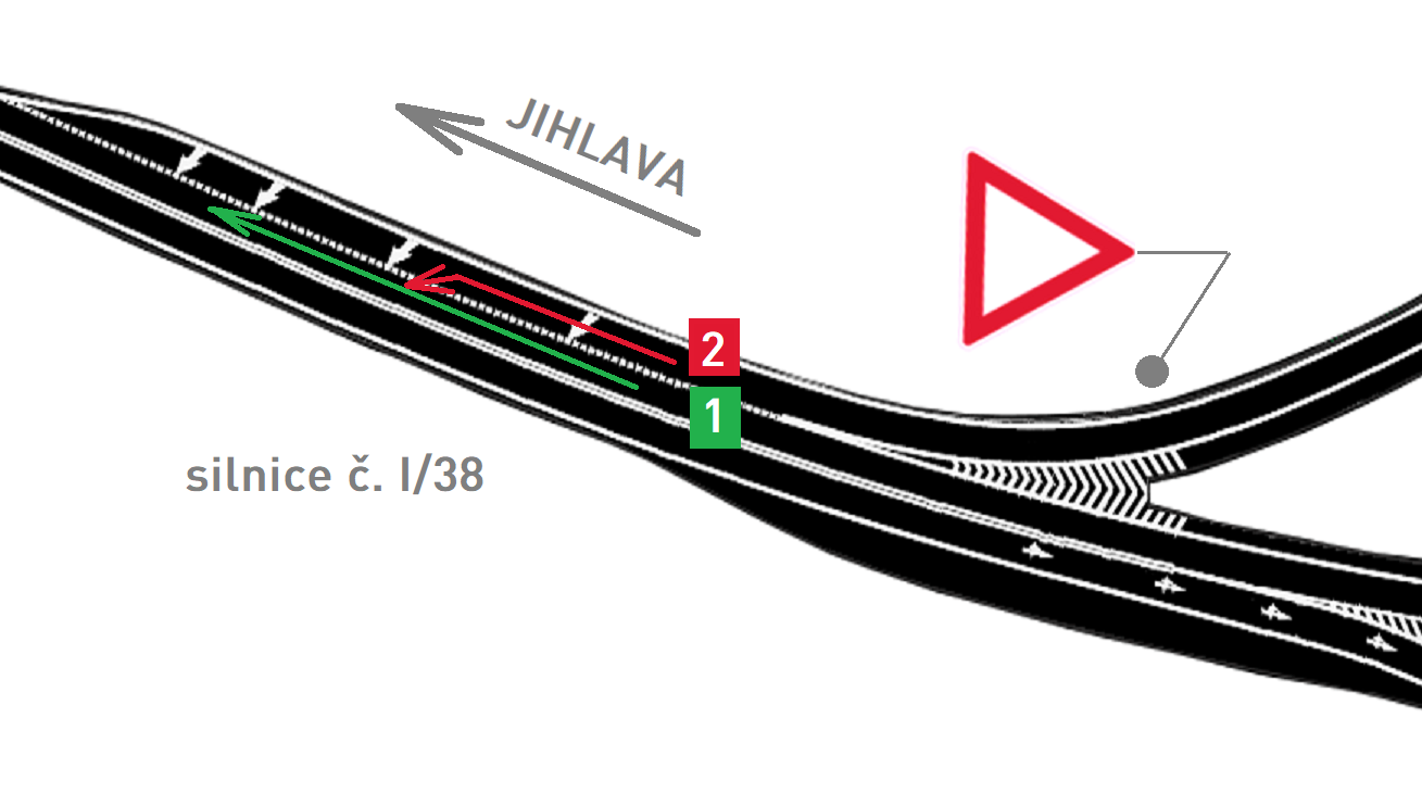 "Po otevření části obchvatu Znojma v úseku křižovatka Kasárna a křižovatka Nová nemocnice se setkáváme s nedodržováním ustanovení zákona o provozu na pozemních komunikacích ze strany řidičů jedoucích po silnici č. I/38 ve směru od Znojma na Jihlavu. Předmětný jízdní pruh v křižovatce "Jihlavská" je v současné době označen svislou dopravní značkou č. P4 - "Dej přednost v jízdě!" a vodorovnou dopravní značkou č. V9c - "Předběžné šipky". Upozorňujeme řidiče, kteří se po sjetí z mostu zařazují z připojovacího pruhu na hlavní silnici, že musí dát přednost vozidlům přijíždějícím po části obchvatu Znojma. V dané situaci se jedná o křižovatku s vyznačením přednosti v jízdě. Nejde o situaci, kdy se dva jízdní pruhy sbíhají a platí na nich pravidlo tzv. zipu. Na základě sdělení některých řidičů, zde dochází k mnoha kolizním situacím a policisté se této problematice věnují." Sdělil vedoucí dopravního inspektorátu územního odboru Znojmo npor. Mgr. Robert Pešek a přikládá i situační plánek: