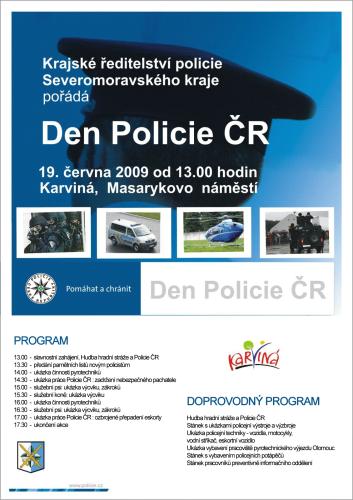 Letos se slavnostní den za Krajské ředitelství policie Severomoravského kraje uskuteční v Karviné na Masarykově náměstí. Dovolujeme si pozvat širokou veřejnost v pátek 19.6.2009 od 13 hodin.