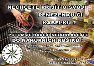 Jako například starší žena v Nové Pace, která se ve středu 24. srpna ráno vydala na nákup do jednoho z místních marketů. Po příchodu do prodejny si zavěsila svoji kabelku na nákupní košík a poté se plně věnovala vystavenému zboží. Její chvilkové nepozornosti zřejmě využil neznámý pachatel, který jí v nestřeženém okamžiku z tašky odcizil peněženku. Kromě hotovosti přišla žena i o své osobní doklady a platební kartu, u které měla vyznačený PIN kód. Pro zloděje není nic snazšího, než se vydat k nejbližšímu bankomatu a za pomocí platební karty vybrat z bankovního účtu peníze. Nejinak tomu bylo i v tomto případě. Než žena zjistila, že nemá peněženku, už jí pachatel stačil z účtu vybrat 15 tisíc korun.