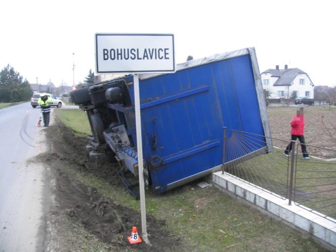 Dne 24. 11. 2011 kolem čtrnácté hodiny v Bohuslavicích došlo k dopravní nehodě nákladní soupravy. Osmatřicetiletý řidič nákladního vozidla Volvo z Uničova projížděl obcí, kdy se mu mělo odlomit oko u přívěsu, který se odpojil a skončil mimo silnici v poltě, kde se zastavil. Při nehodě nebyl nikdo zraněn. Dechová zkouška u řidiče byla negativní. Celková škoda na vozidle činí 160000 Kč a na plotě 20000 Kč. Jako předběžná příčina nehody byla stanovena technická závada na vozidle, věc je i nadále v šetření policie.