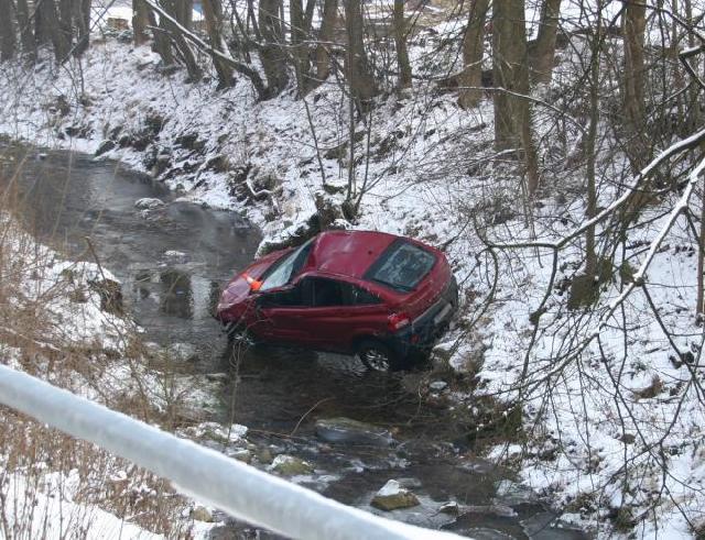 Druhá nehoda se stala o půl jedenácté dopoledne v Travné. 47letý majitel vozu Ssang Yong jel v obci Travná a při průjezdu levotočivou zatáčkou dostal na zledovatělé vozovce smyk. S autem přejel na levou krajnici. Zde zavadil o kovové zábradlí a sjel s vozidlem do koryta potoku, přičemž se auto převrátilo na střechu. Řidič utrpěl lehké zranění, se kterým byl převezen do Jesenické nemocnice. Vozidlo bylo krátce po nehodě převráceno zpět na kola, aby nedošlo k úniku paliva a následně bylo vytaženo jeřábem Hasičského záchranného sboru z Jeseníku.