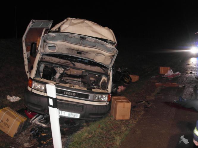 Včera v 21.30 jeden kilometr před sjezdem na Nové Město ( 66. km  dálnice D 11) směrem na Hradec Králové se stala  tragická dopravní nehoda nákladního vozidla zn. Iveco Daily. Pravděpodobnou příčinou nehody bylo nedodržení rychlosti a maximální konstrukční hmotnosti vozidla - auto bylo přetížené nákladem převáženého textilu. Tím asi došlo k defektu pneumatiky a  vozidlo se dostalo do smyku, při kterém vjelo vpravo na krajnici a převrátilo se přes střechu.  Spolujezdec  nebyl při jízdě řádně připoután bezpečnostním pásem a pravděpodobně prolétl bočním okénkem ven.  Vozidlo ho přimáčklo k zemi a poté se vrátilo na kola.  Muž na místě přes všechnu snahu lékařů zemřel. Řidič utrpěl lehké zranění a byl odvezen vozidlem RLP do Fakultní nemocnice Hradec Králové.