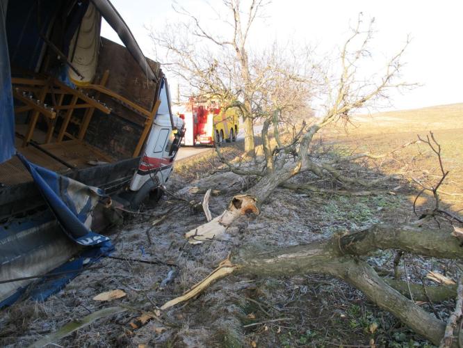 K další dopravní nehodě došlo v pondělí v 8:40 hodin na komunikaci mezi obcemi České Meziříčí a Králova Lhota. Řidič nákladní soupravy vozidla tovární značky Mercedes Benz s návěsem uvedl, že ve snaze vyhnout se nákladnímu vozidlu jedoucímu v protisměru, najel na pravou krajnici. Pod tíhou nákladní soupravy se však její nezpevněná část utrhla.  Řidič se údajně pokoušel dostat zpět na silnici, to se mu však nepodařilo. Nákladní souprava jela příkopem a postupně narazila do tří stromů. Škoda dosáhla částky 150.000 korun.