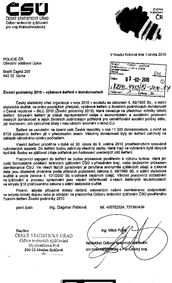 Policie České republiky v Trutnově informuje všechny občany z trutnovského regionu, že na základě oznámení zaslaného Českým statistickým úřadem v souladu se zákonem číslo 89/1995 Sb., O státní statistické službě proběhne od 20. února do 9. května 2010 výběrové šetření o životních podmínkách domácností v České republice – SILC 2010.