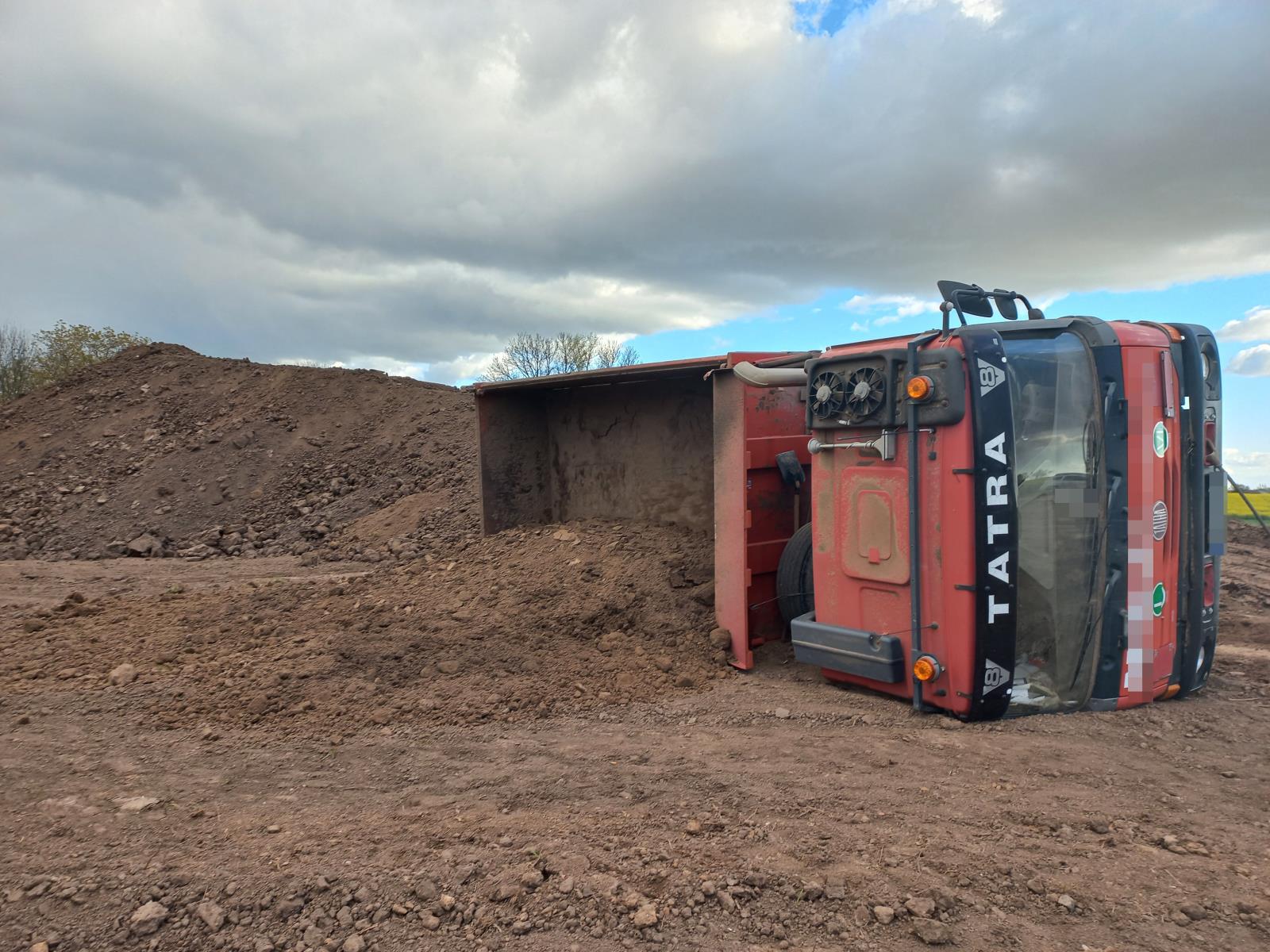 Řidič tatrovky měl převážet hlínu z nedaleké stavby dálnice na dané místo, kde při najetí na val, na který hlínu vysypával, převrátil auto na bok. Škoda zatím nebyla vyčíslena, ale bylo zjištěno, že muž měl vypít litrovou láhev vodky během výkonu své práce.
