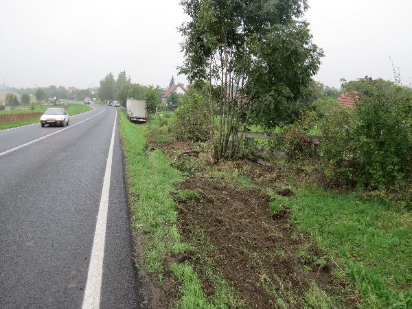 RYCHNOVSKO - Kamion narazil do ohrady, stromu a dopravní značky.
