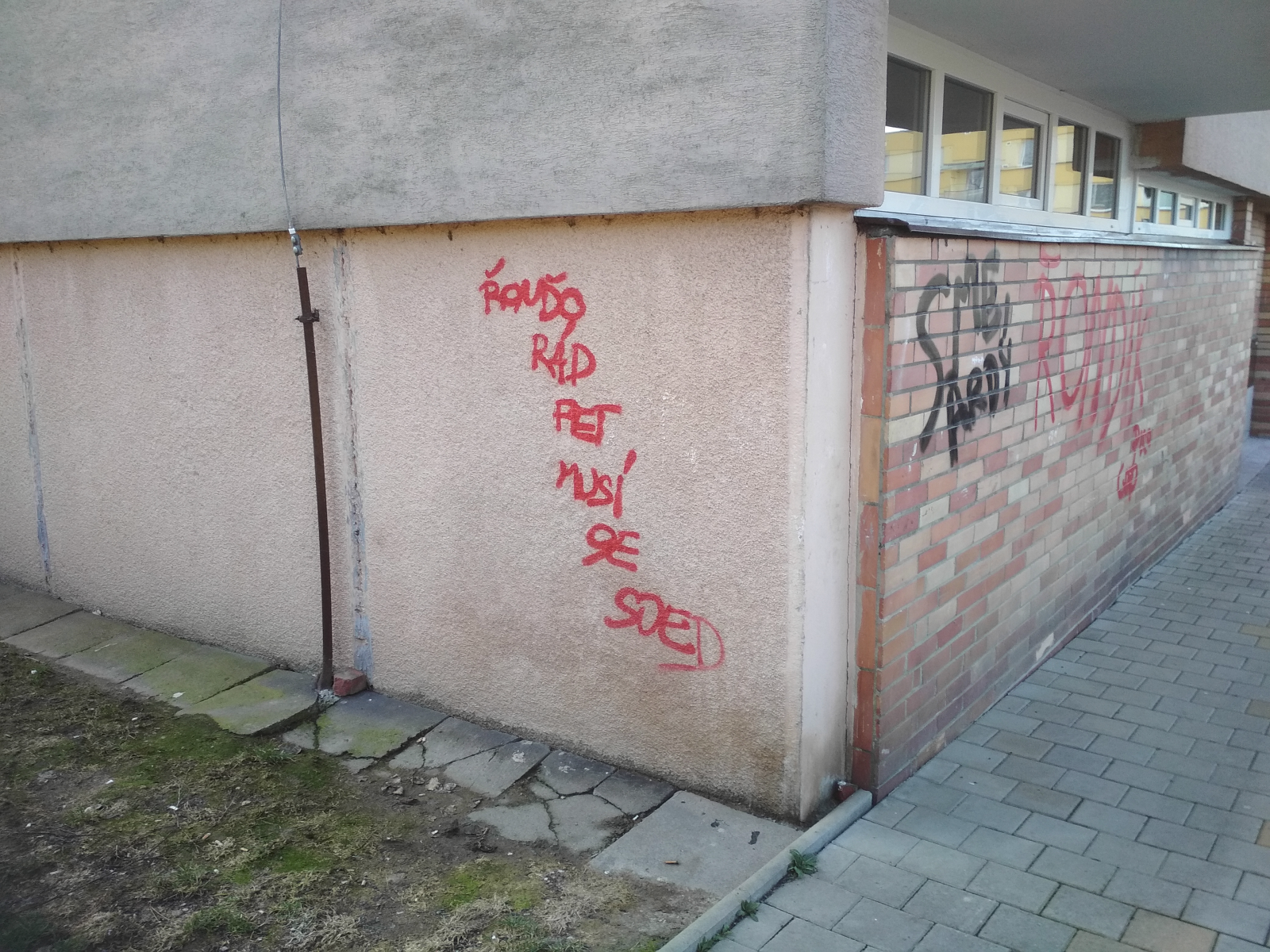Na bytový dům na sídlišti Jana Patočky v Turnově někdo zase červeným sprejem napsal několik vzkazů, některé i s pravopisnými chybami. Pro zajímavost je uvádíme v jejich autentické podobě : "Řauďo rád fet musí se sjed", "Sme hrdý", "Řondík", "Pico gopo". Tím majiteli způsobili také třicetitisícovou škodu.sprejerství Turnov 2