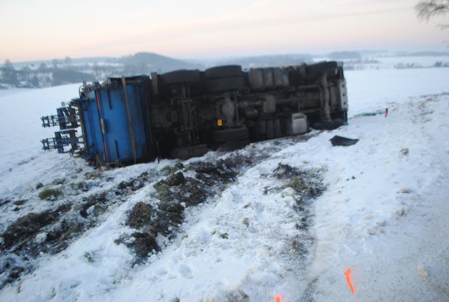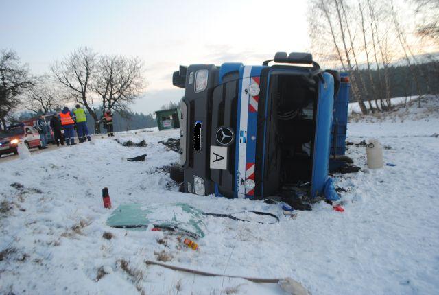 Ve směru od obce Roveň k obci Všelibice jel 26-letý muž z Rádla s vozidlem značky Mercedes Actros. Na křižovatce, v pravotočivé zatáčce, nepřizpůsobil rychlost stavu a povaze zledovatělé neposypané komunikace, dostal smyk a vyjel vlevo mimo silnici, kde se vozidlo převrátilo na levý bok.