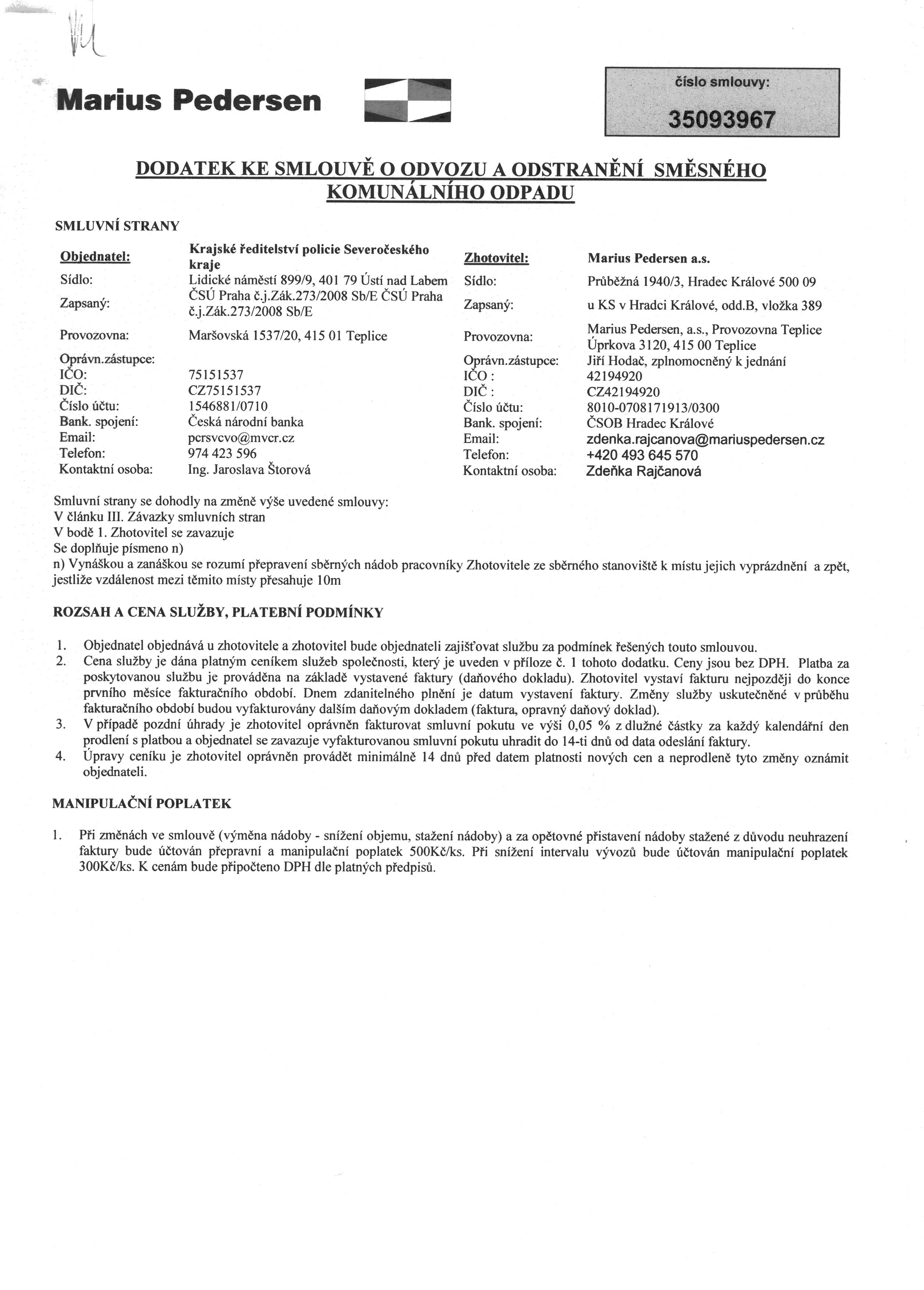 3. Požadovanou kopii dodatku smlouvy č. 35093967 o odvozu a odstranění směsného komunálního odpadu platného od 1. 1. 2017 zasíláme v příloze (touto kopií Policie České republiky, KŘP Ústeckého kraje dosud nedisponovala, na základě vaší žádosti o poskytnutí informace dle zákona č. 106/1999 Sb., o svobodném přístupu k informacím, ve znění pozdějších předpisů z 11. 8. 2017 byla vyžádána od zhotovitele – firmy Marius Pedersen a.s. – zasíláme v příloze (2 listy ve formátu pdf)).