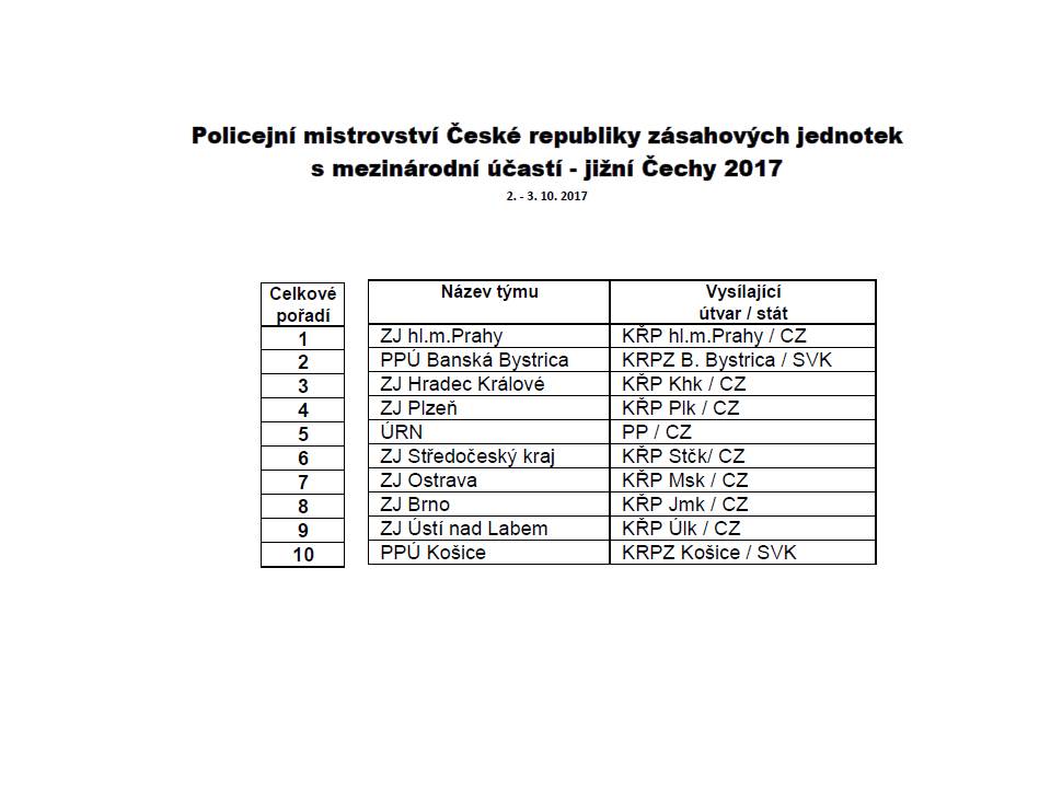 A jak tedy celé mistrovství dopadlo? Na úterním slavnostním večeru vyhlásil vítěze jihočeský policejní ředitel Luděk Procházka. Podle výsledků a dosažených časů jsou všichni vítězové, podle hodnocení a započítání penalizací obsadil bronzové místo tým zásahové jednotky královehradeckého policejního ředitelství. Druhé místo, stříbrný pohár získal tým ze Slovenska, pohotovostní útvar Bánská Bystrica. Úplnými mistry se pak ziskem prvního místa v těchto mezinárodních závodech stali profesionálové z Krajského policejního ředitelství  hl. města Prahy.