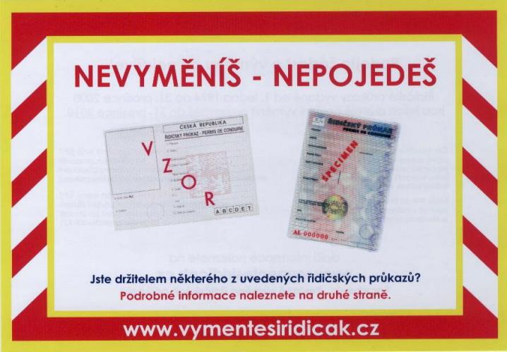 nevyměníš - nepojedeš1Vlastníte ještě řidičský průkaz vydaný od 1. ledna 1994 do 31. prosince 2000? Připomínáme, že jste povinni si ho Silvestra tohoto roku vyměnit. Policisté tuto povinnost řidičům při silničních kontrolách také připomínají a rozdávají jim letáčky vydané Ministerstvem dopravy s názvem „Nevyměníš – nepojedeš“. Několik informací uvádíme i zde.