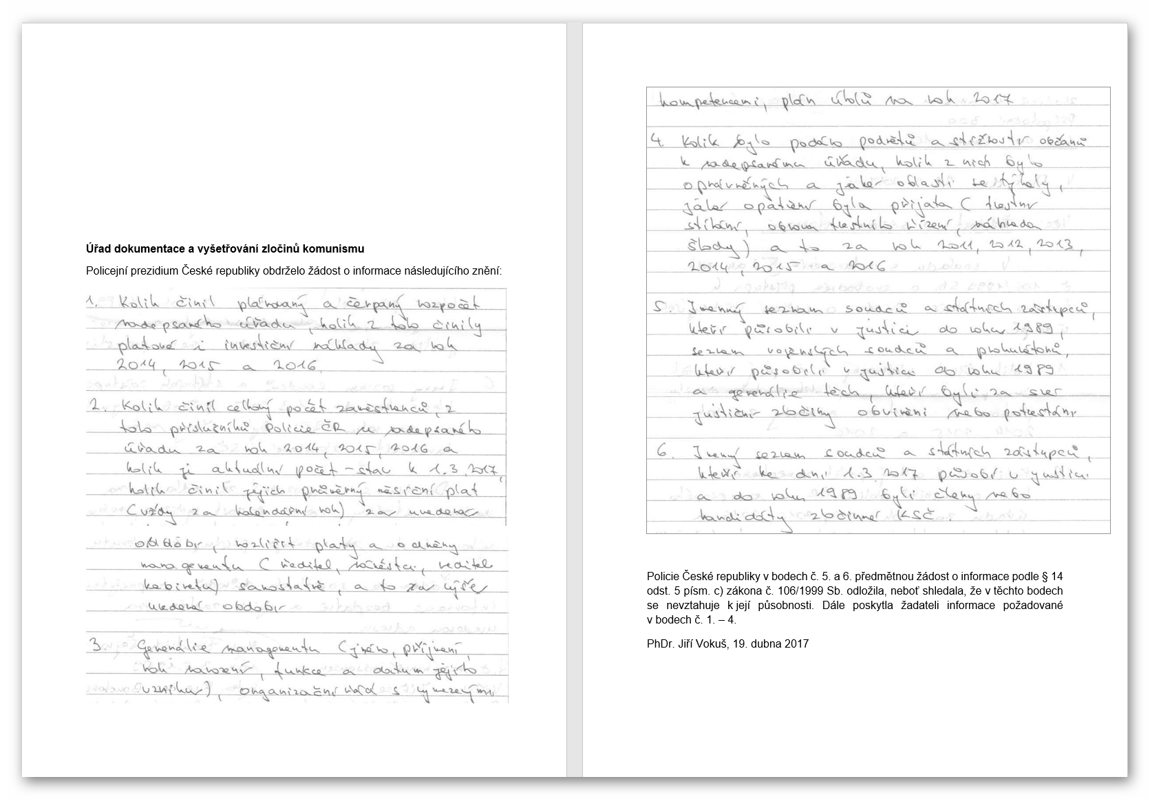 Policie České republiky v bodech č. 5. a 6. předmětnou žádost o informace podle § 14 odst. 5 písm. c) zákona č. 106/1999 Sb. odložila, neboť shledala, že v těchto bodech se nevztahuje k její působnosti. Dále poskytla žadateli informace požadované v bodech č. 1. – 4.