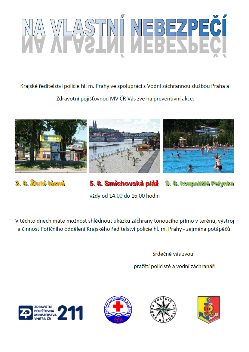 2. 8. Žluté lázně, 5. 8. Smíchovská pláž, 9. 8. koupaliště Petynka - vždy od 14.00 do 16.00 hodin