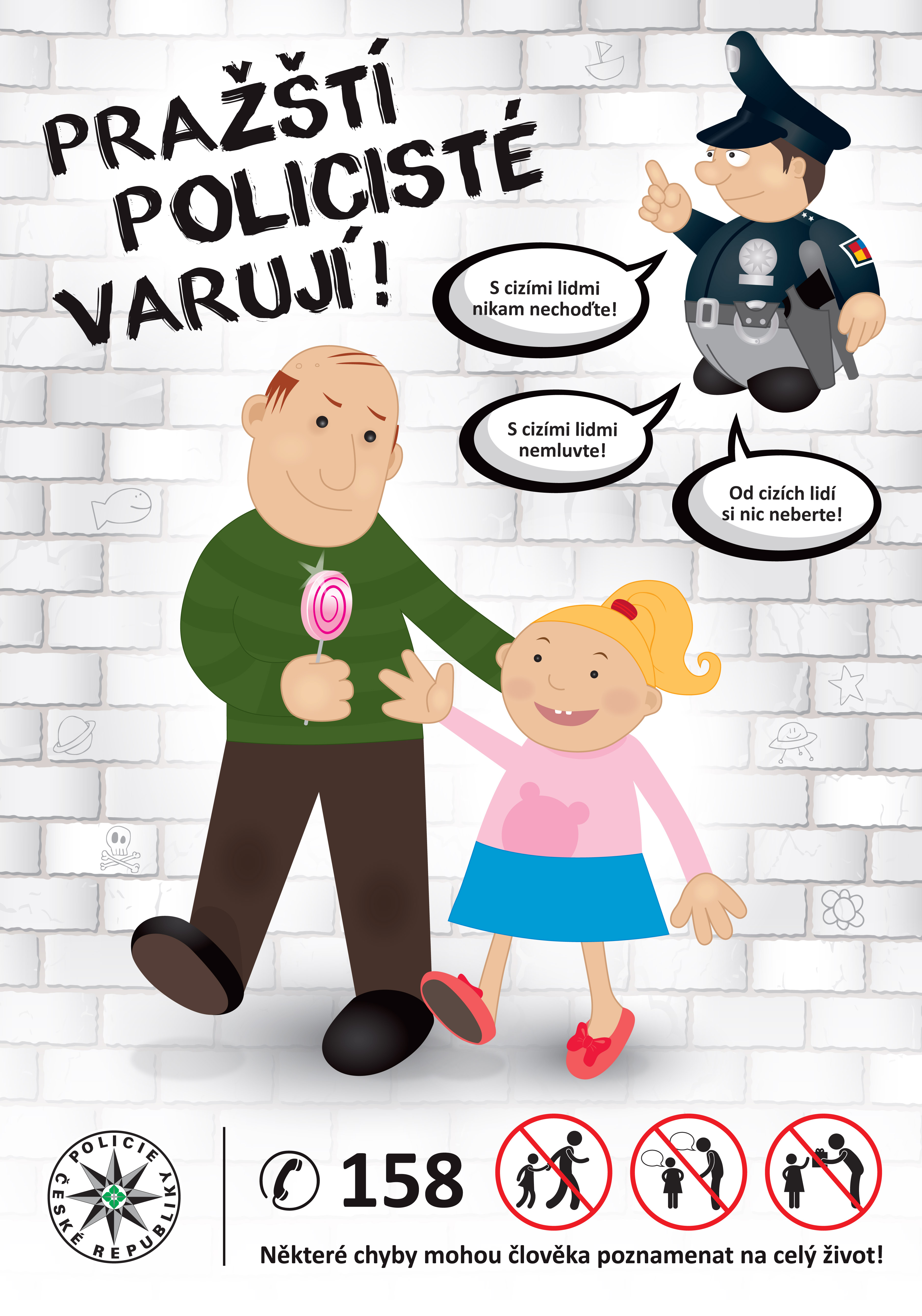 První plakát je určen pro děti z mateřských školek a prvního stupně základních škol. Dětem dobře známý Poldík, zde zdůrazňuje tři základní zásady bezpečného chování dětí při kontaktu s cizí osobou. Ve spodní části jsou názorné piktogramy zobrazující nesprávné chování. To je také ústředním motivem hlavní části plakátu, kde je zachycena situace, kdy muž nabízí dívence lízátko, povídá si s ní a odvádí jí na odlehlé místo.