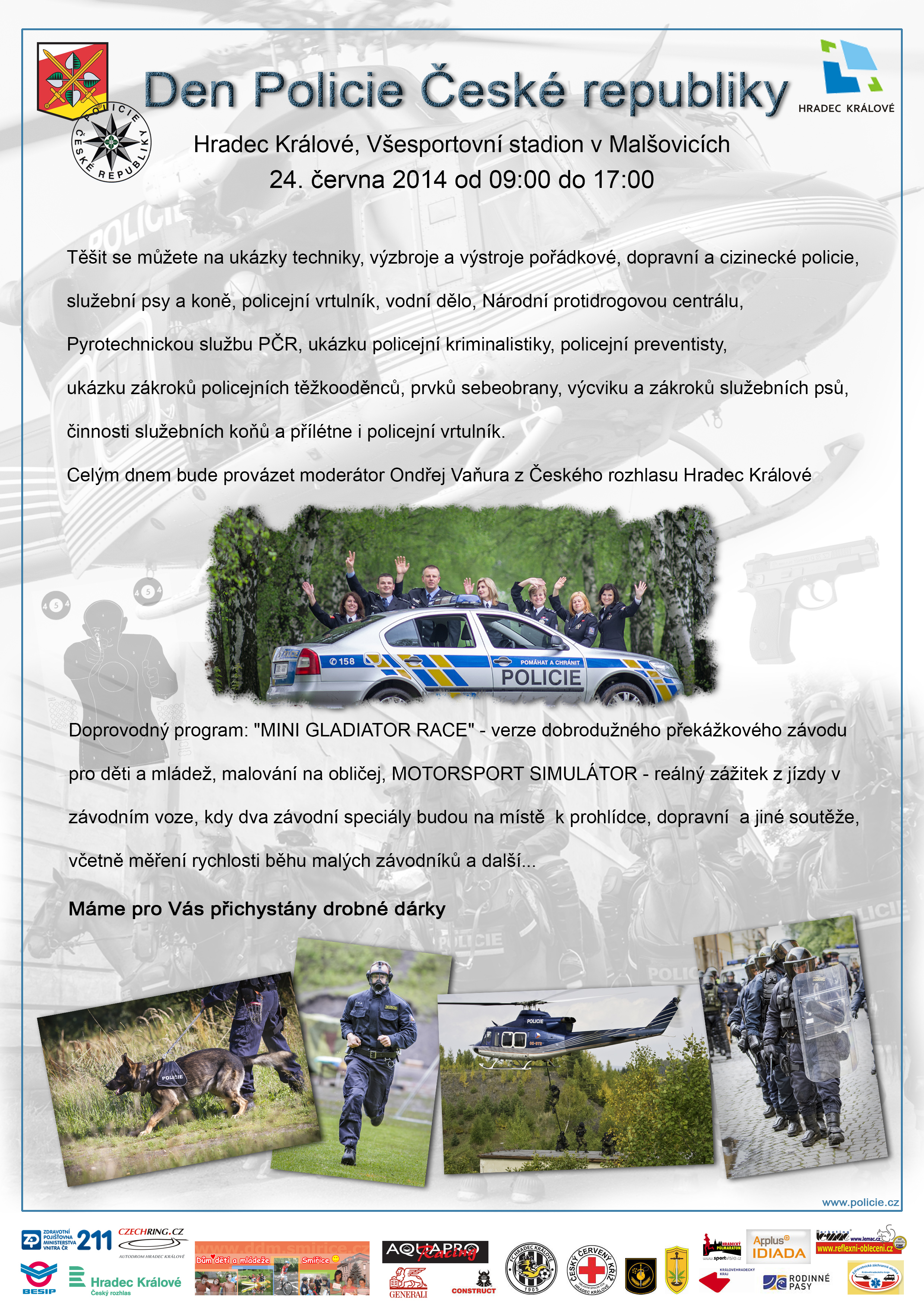Srdečně Vás zveme na Den Policie České republiky, který se bude konat 24. června 2014 od 9:00 do 17:00 na všesportovním stadionu v Hradci Králové - Malšovicích.